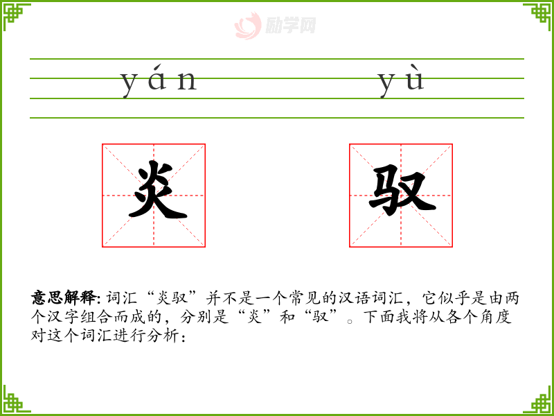 词汇“炎驭”并不是一个常见的汉语词汇,它似乎是由两个汉字组合而成的,分别是“炎”和“驭”。下面我将从各个角度对这个词汇进行分析: