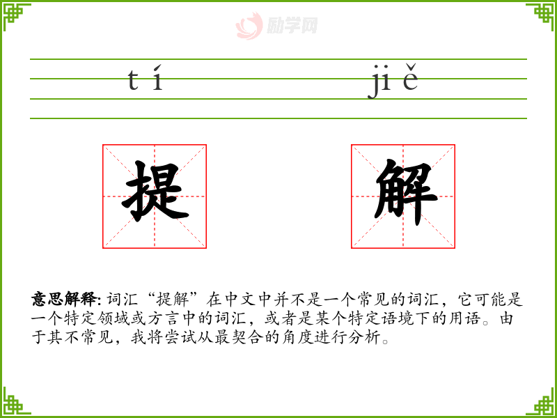 词汇“提解”在中文中并不是一个常见的词汇,它可能是一个特定领域或方言中的词汇,或者是某个特定语境下的用语。由于其不常见,我将尝试从最契合的角度进行分析。