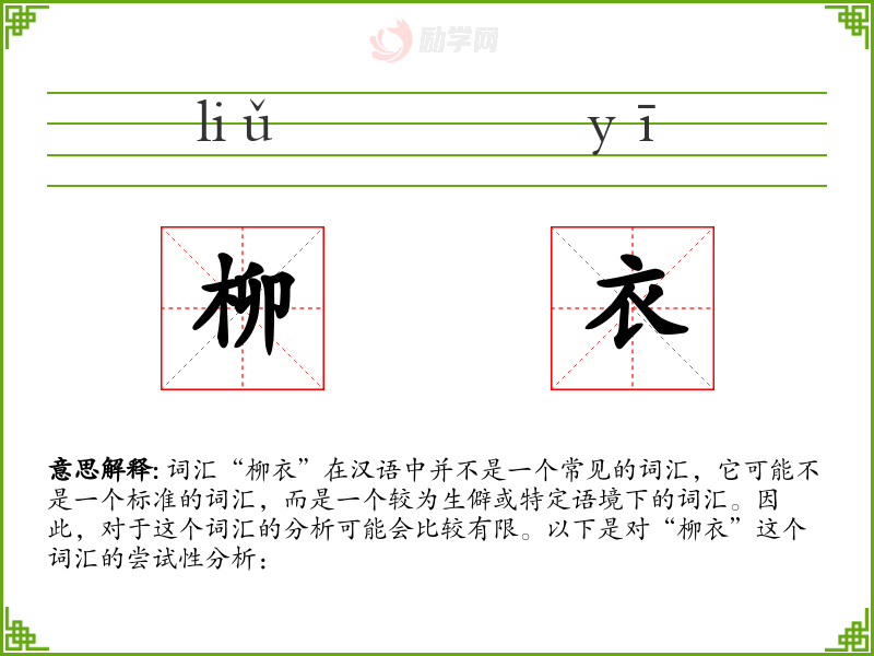 词汇“柳衣”在汉语中并不是一个常见的词汇,它可能不是一个标准的词汇,而是一个较为生僻或特定语境下的词汇。因此,对于这个词汇的分析可能会比较有限。以下是对“柳衣”这个词汇的尝试性分析: