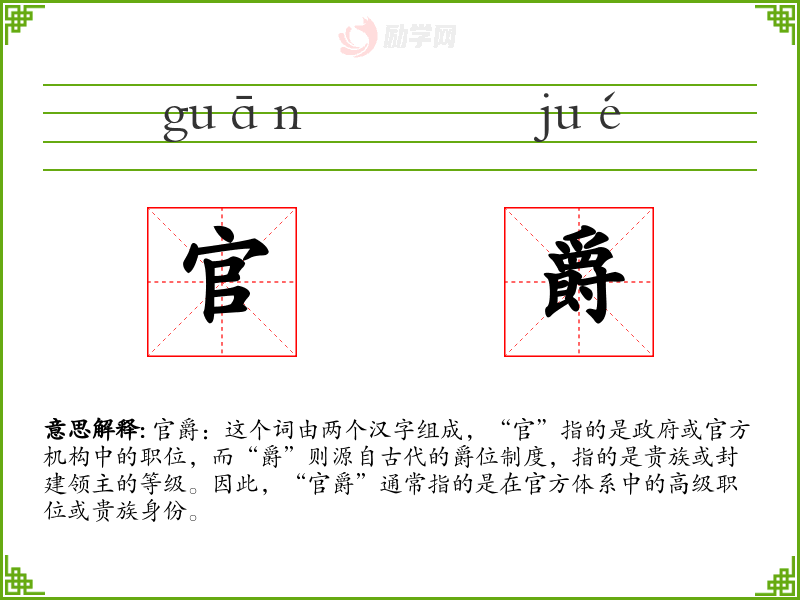官爵:这个词由两个汉字组成,“官”指的是政府或官方机构中的职位,而“爵”则源自古代的爵位制度,指的是贵族或封建领主的等级。因此,“官爵”通常指的是在官方体系中的高级职位或贵族身份。