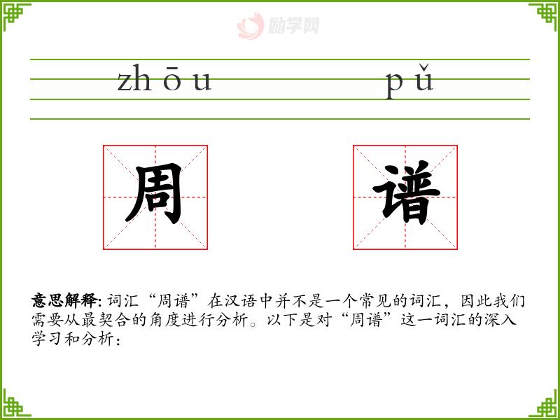 - 反义词:无(由于“周谱”不是一个常用词汇,反义词可能不适用)