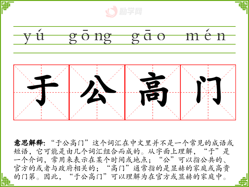 “于公高门”这个词汇在中文里并不是一个常见的成语或短语,它可能是由几个词汇组合而成的。从字面上理解,“于”是一个介词,常用来表示在某个时间或地点;“公”可以指公共的、官方的或者与政府相关的;“高门”通常指的是显赫的家庭或高贵的门第。因此,“于公高门”可以理解为在官方或显赫的家庭中。