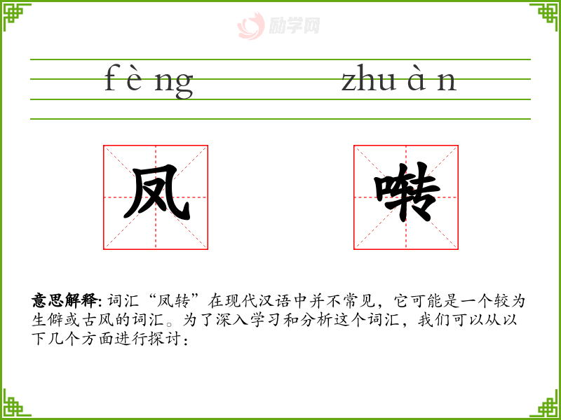 词汇“凤转”在现代汉语中并不常见,它可能是一个较为生僻或古风的词汇。为了深入学*和分析这个词汇,我们可以从以下几个方面进行探讨: