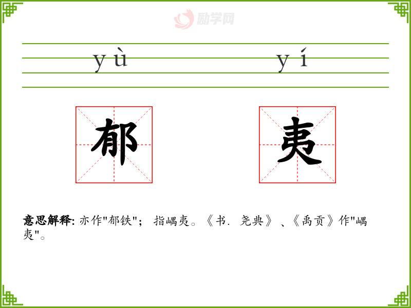 郁夷的意思是:亦作"郁铁"; 指嵎夷。《书.尧典》﹑《禹贡》作"嵎夷"。