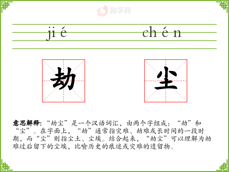 “劫尘”这个词深刻地反映了历史的沧桑和人类的苦难,它在文学和历史学中有着重要的应用。通过对这个词的学*和分析,我更加理解了历史的重要性和和平的珍贵。