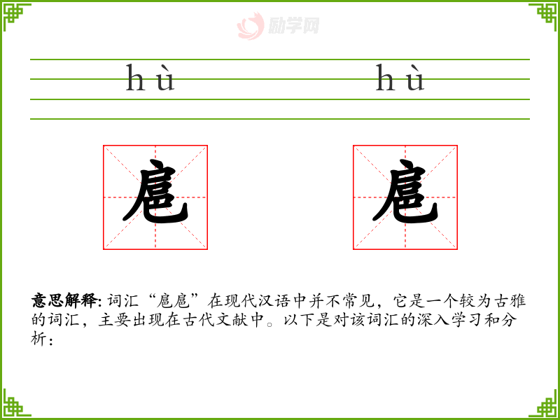 “扈扈”这个词汇虽然在现代汉语中不常用,但它反映了古代汉语的丰富性和文化特色。了解和学*这样的词汇有助于更深入地理解*古代文化和语言的演变。在语言学和表达中,虽然不常直接使用,但对其的理解可以丰富词汇量和语言表达的深度。
