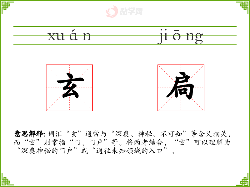 词汇“玄”通常与“深奥、神秘、不可知”等含义相关,而“玄”则常指“门、门户”等。将两者结合,“玄”可以理解为“深奥神秘的门户”或“通往未知领域的入口”。