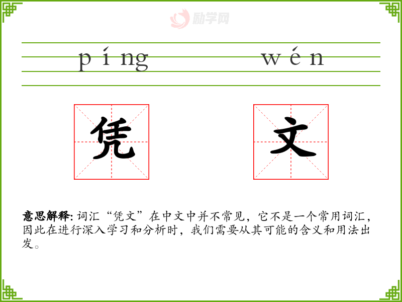 词汇“凭文”在中文中并不常见,它不是一个常用词汇,因此在进行深入学习和分析时,我们需要从其可能的含义和用法出发。