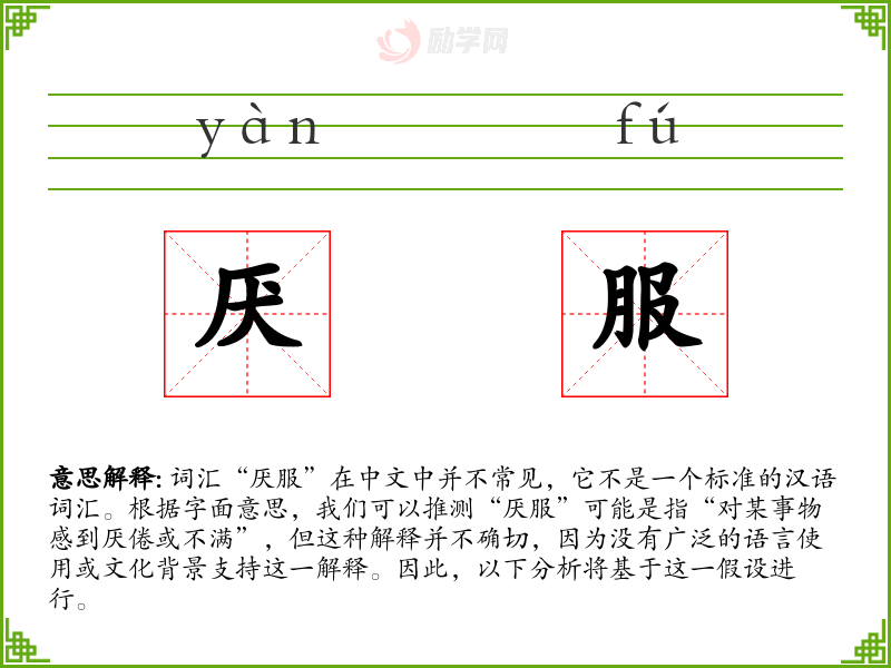 词汇“厌服”在中文中并不常见,它不是一个标准的汉语词汇。根据字面意思,我们可以推测“厌服”可能是指“对某事物感到厌倦或不满”,但这种解释并不确切,因为没有广泛的语言使用或文化背景支持这一解释。因此,以下分析将基于这一假设进行。
