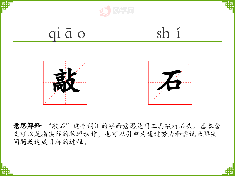 “敲石”这个词汇的字面意思是用工具敲打石头。基本含义可以是指实际的物理动作,也可以引申为通过努力和尝试来解决问题或达成目标的过程。