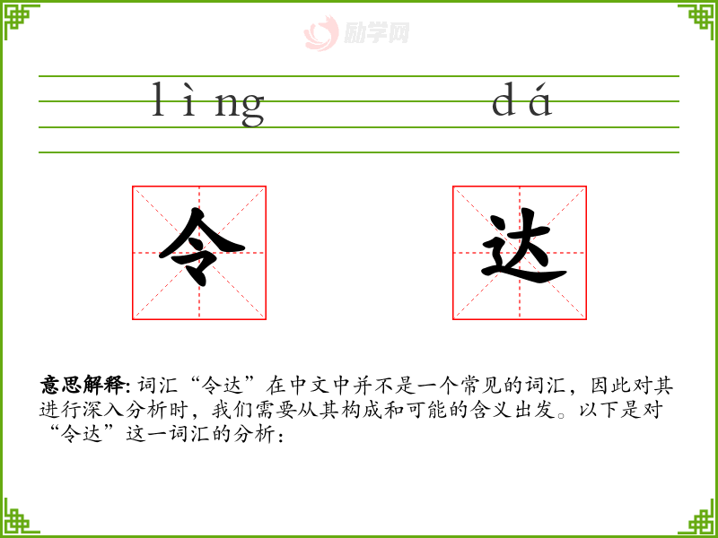 词汇“令达”在中文中并不是一个常见的词汇,因此对其进行深入分析时,我们需要从其构成和可能的含义出发。以下是对“令达”这一词汇的分析: