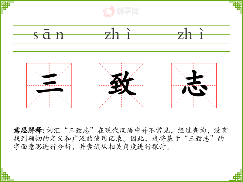 由于“三致志”不是一个常用词汇,其词源和演变不详。