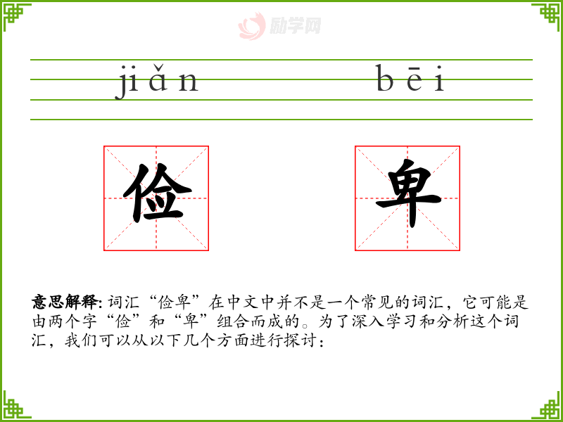 词汇“俭卑”在中文中并不是一个常见的词汇,它可能是由两个字“俭”和“卑”组合而成的。为了深入学*和分析这个词汇,我们可以从以下几个方面进行探讨: