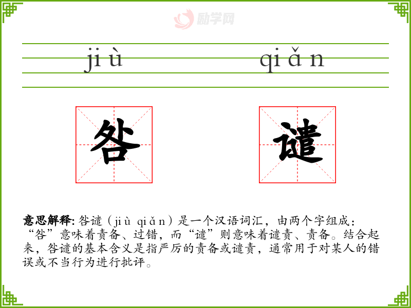 - 专业领域:在法律或道德伦理讨论中,咎谴可能用于正式的批评或谴责,如“法庭对被告的行为进行了咎谴”。