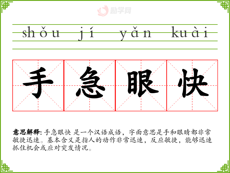 手急眼快 是一个汉语成语,字面意思是手和眼睛都非常敏捷迅速。基本含义是指人的动作非常迅速,反应敏捷,能够迅速抓住机会或应对突发情况。