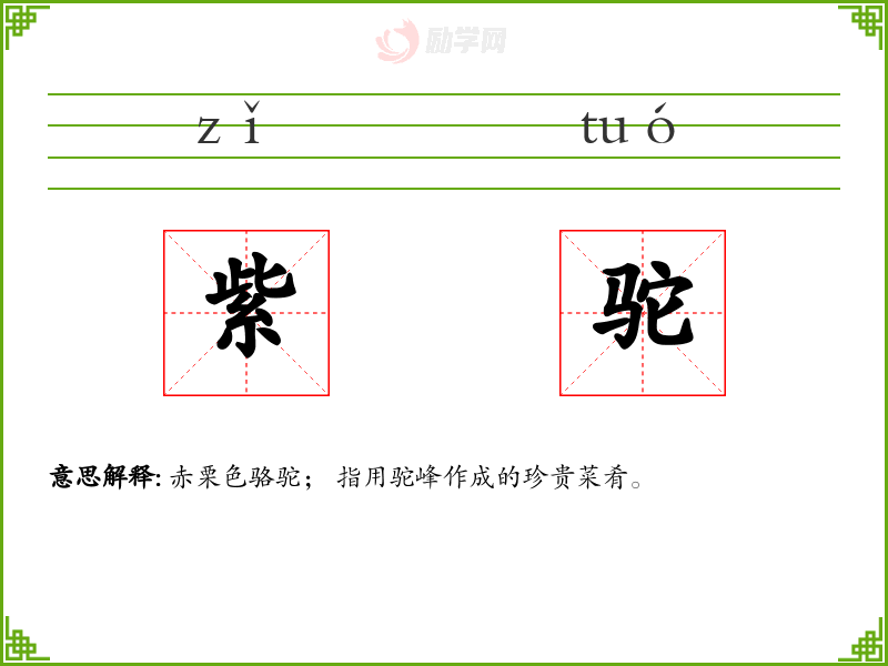 紫驼的意思是:赤栗色骆驼; 指用驼峰作成的珍贵菜肴。