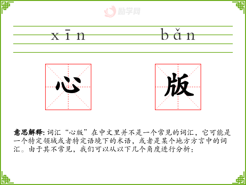 对于不常见的词汇“心版”,我们可能需要更多的信息和语境来准确理解其含义和用法。在语言学*和表达中,了解特定领域或方言中的词汇也是很重要的。