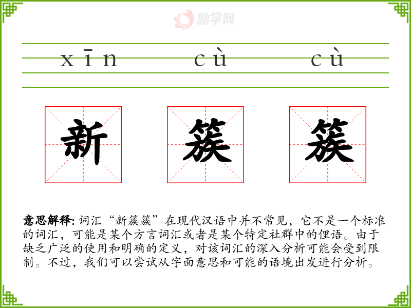 “新簇簇”从字面上看,“新”表示新鲜、崭新,“簇簇”可能是形容词后缀,用来加强“新”的程度,整体上可能表示非常新、簇新的意思。