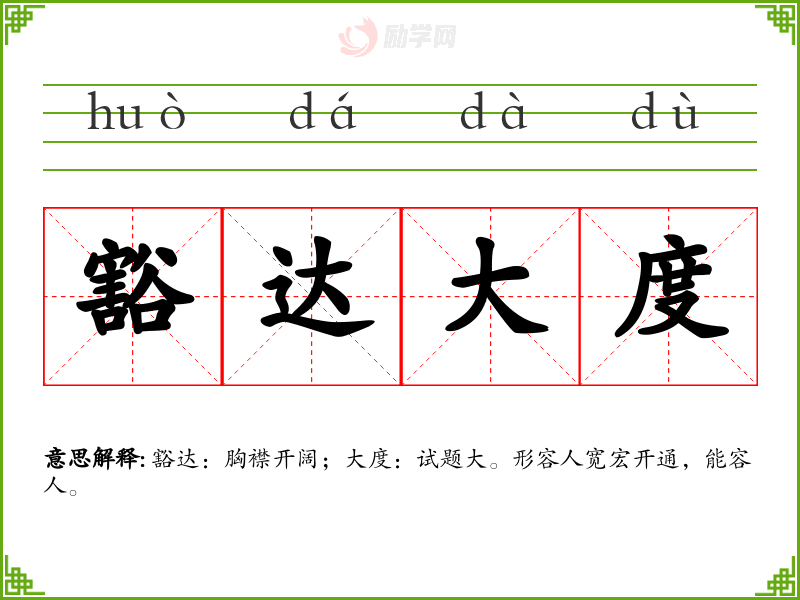 豁达:胸襟开阔;大度:试题大。形容人宽宏开通,能容人。