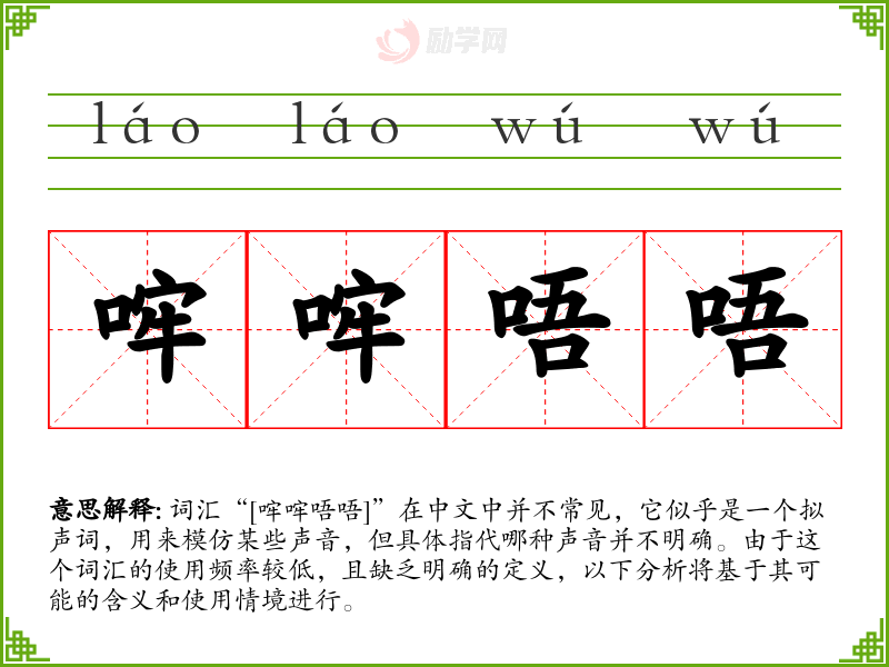 词汇“[哰哰唔唔]”在中文中并不常见,它似乎是一个拟声词,用来模仿某些声音,但具体指代哪种声音并不明确。由于这个词汇的使用频率较低,且缺乏明确的定义,以下分析将基于其可能的含义和使用情境进行。