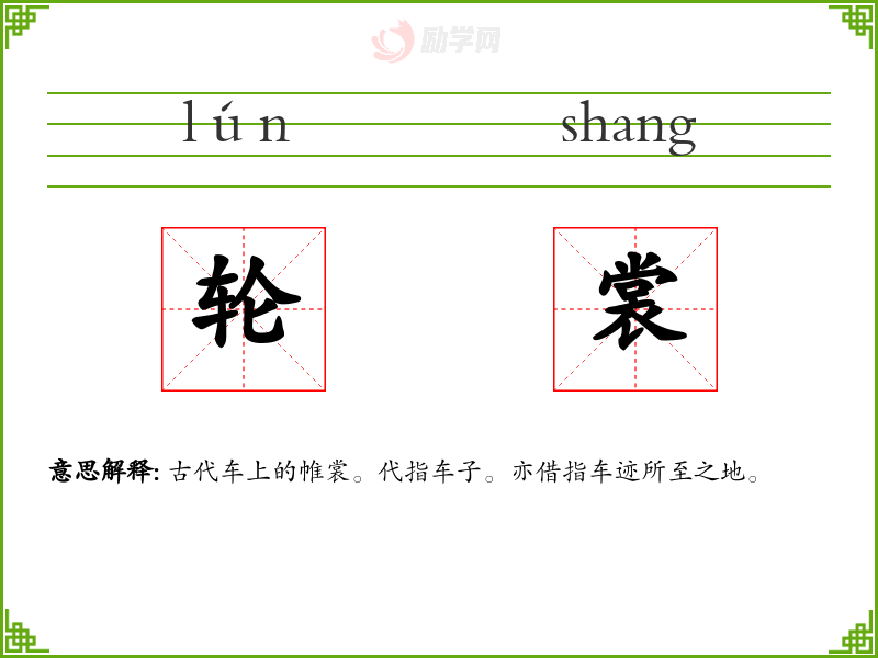 轮[ lún ] 1. (形声。从车,仑(lún)声。本义:车轮,轮子)。 2. 同本义。 【引证】 《说文》。按,考工有轮人。-轮,有辐曰轮,无辐曰辁。 《易·说卦》-坎为弓轮。 《荀子·劝学》-輮以为轮。 《玉台新咏·古诗为焦仲卿妻作》-金车玉作轮。 【组词】 轮指、 轮轭、 轮崇 [更多解释]