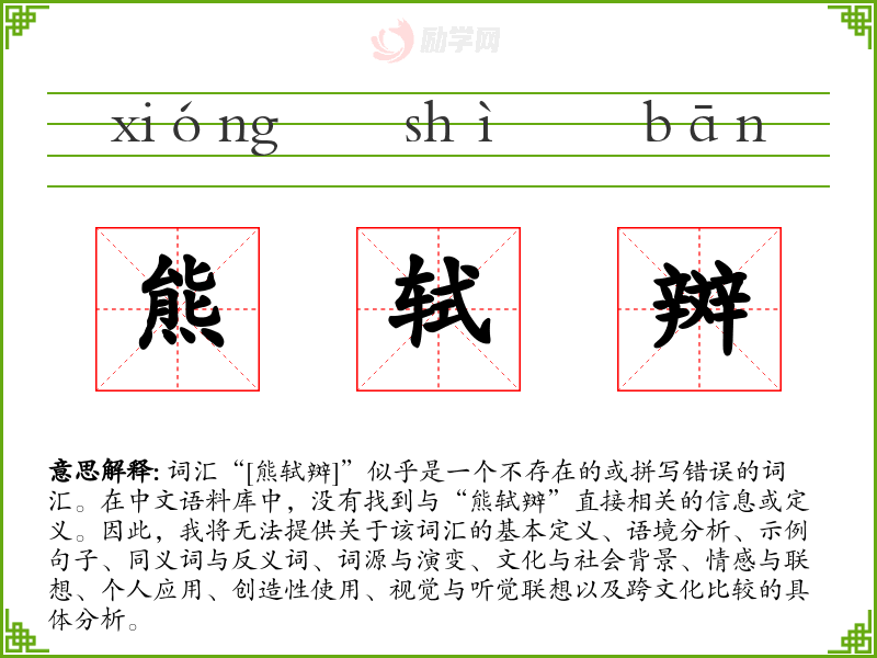 反思与总结:由于“熊轼辬”不是一个已知的词汇,它的解释和应用具有很大的开放性和创造性。在语言学习和表达中,这样的词汇可以激发想象力和创新思维。