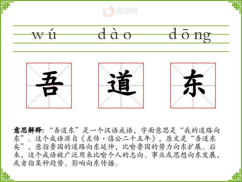 “吾道东”源自《左传》,最初是指鲁国的道路向东延伸。随着时间的推移,这个成语的含义逐渐扩展,用来比喻个人的志向、事业或思想向东发展。