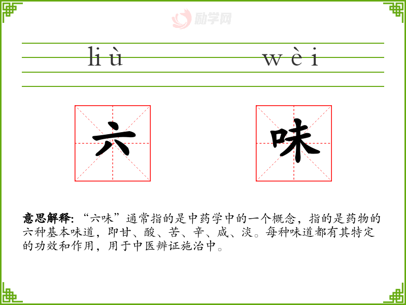 - 专业领域:在中医学和中药学中,“六味”是一个基础概念,用于描述药材的性质和功效。