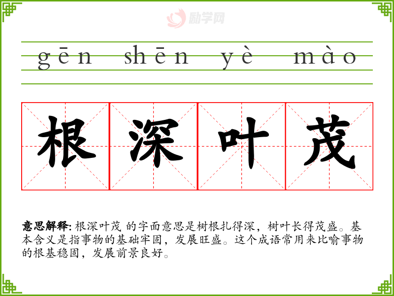 根深叶茂 的字面意思是树根扎得深,树叶长得茂盛。基本含义是指事物的基础牢固,发展旺盛。这个成语常用来比喻事物的根基稳固,发展前景良好。