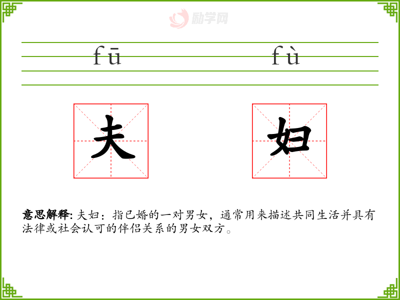 夫妇:指已婚的一对男女,通常用来描述共同生活并具有法律或社会认可的伴侣关系的男女双方。
