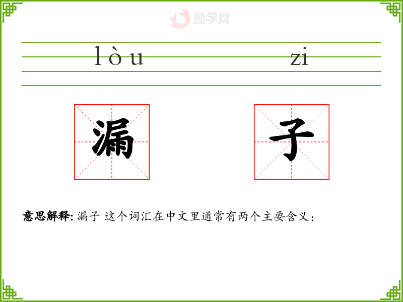 漏子的意思是:孔洞; 毛病;事故; 破绽;漏洞; 漏斗。