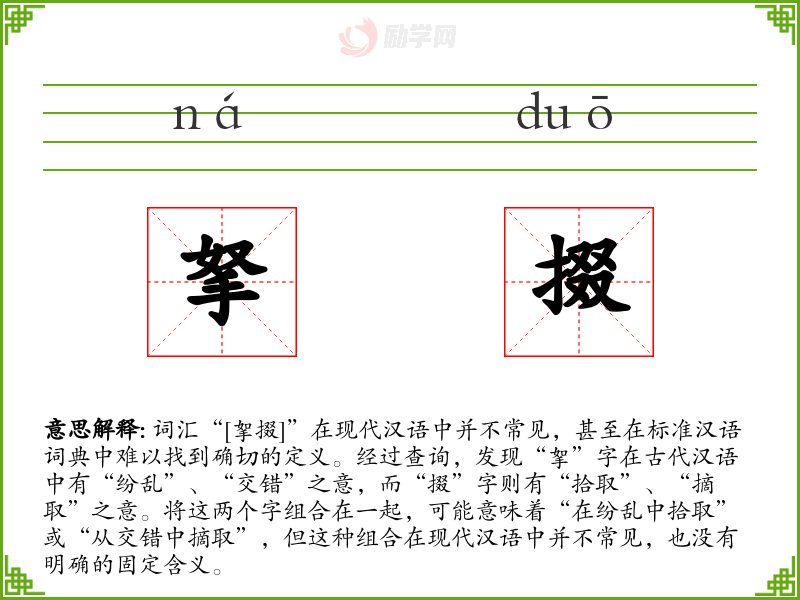 词汇“[挐掇]”在现代汉语中并不常见,甚至在标准汉语词典中难以找到确切的定义。经过查询,发现“挐”字在古代汉语中有“纷乱”、“交错”之意,而“掇”字则有“拾取”、“摘取”之意。将这两个字组合在一起,可能意味着“在纷乱中拾取”或“从交错中摘取”,但这种组合在现代汉语中并不常见,也没有明确的固定含义。