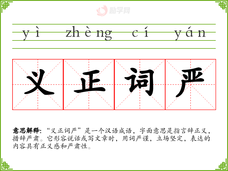 “义正词严”是一个汉语成语,字面意思是指言辞正义,措辞严肃。它形容说话或写文章时,用词严谨,立场坚定,表达的内容具有正义感和严肃性。