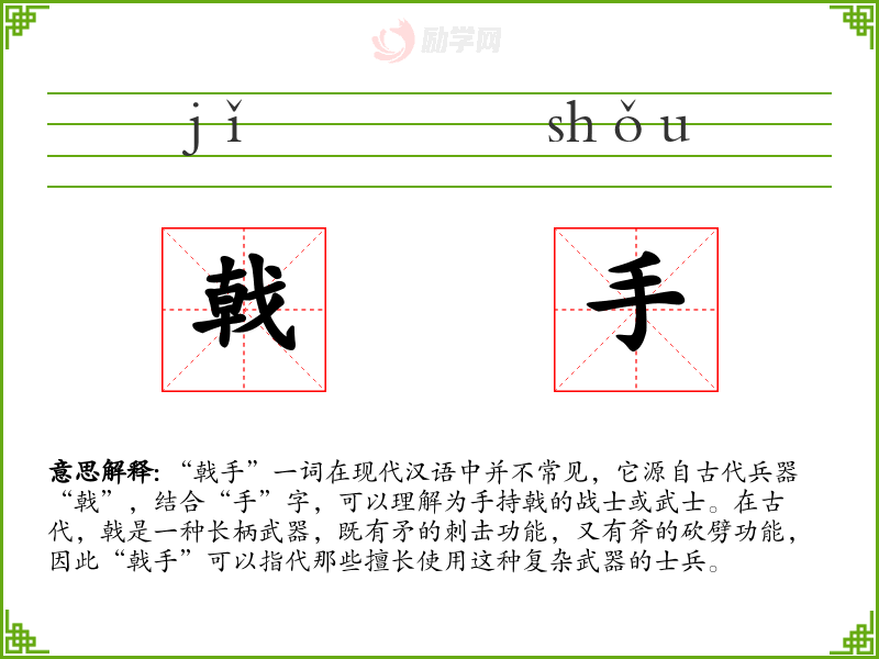 在**古代,武士阶层有着重要的社会地位,“戟手”作为武士的象征,体现了古代社会对武力和勇气的重视。在现代社会,这个词可能更多地被用于历史教育和文化传承中。