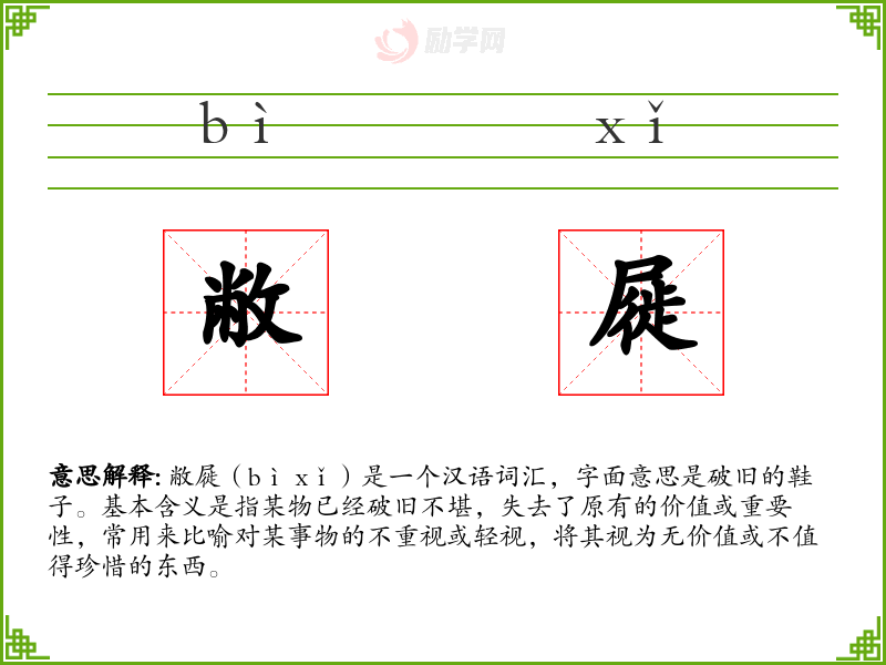 敝屣在文学作品中常用来表达对某事物的轻蔑或不屑,如“视金钱如敝屣”表示对金钱的极度轻视。在口语中,这个词可能不太常用,但在正式或文学性的表达中,它能够传达一种强烈的情感色彩。在专业领域,这个词可能不太常见,除非是在讨论物品的磨损或价值时。