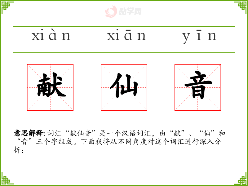 词汇“献仙音”是一个汉语词汇,由“献”、“仙”和“音”三个字组成。下面我将从不同角度对这个词汇进行深入分析: