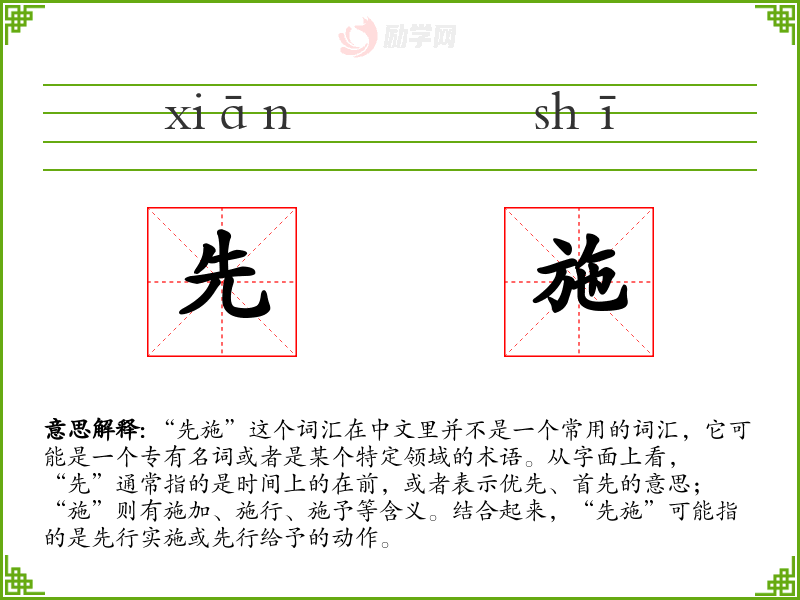 “先施”这个词汇在中文里并不是一个常用的词汇,它可能是一个专有名词或者是某个特定领域的术语。从字面上看,“先”通常指的是时间上的在前,或者表示优先、首先的意思;“施”则有施加、施行、施予等含义。结合起来,“先施”可能指的是先行实施或先行给予的动作。