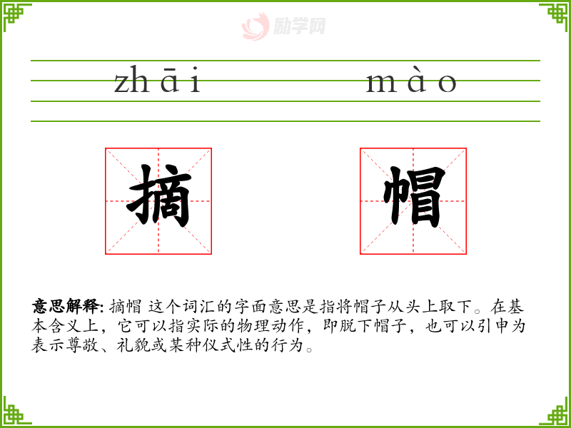 通过对“摘帽”这个词汇的深入学习和分析,我更加理解了它在不同语境下的含义和用法。它不仅是一个简单的动作,更是一种表达尊敬和礼貌的方式。在语言学习和表达中,掌握这样的词汇有助于更准确地传达情感和意图。