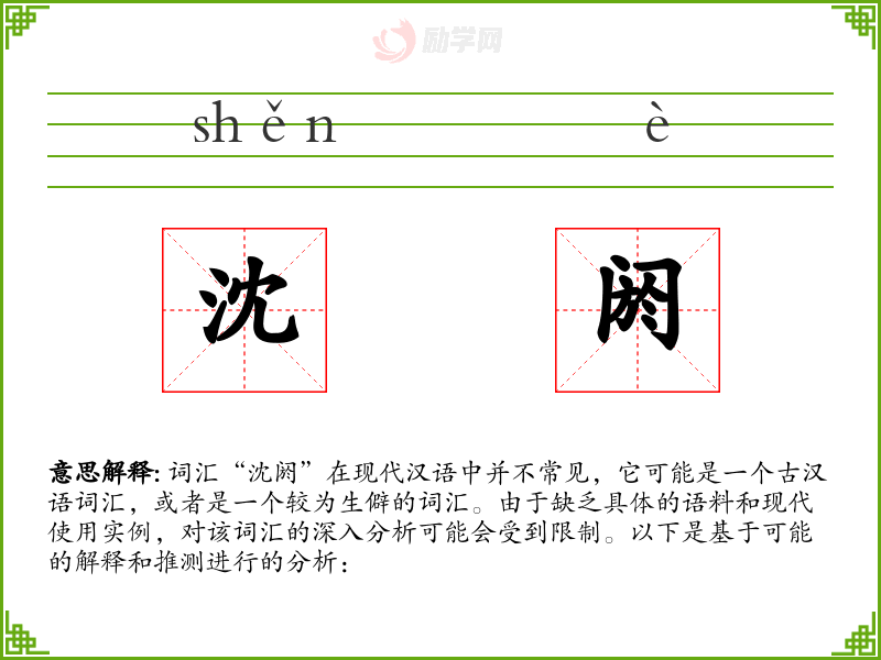由于“沈阏”在现代汉语中不常见,其词源和演变可能需要查阅古汉语词典或相关文献来进一步探讨。