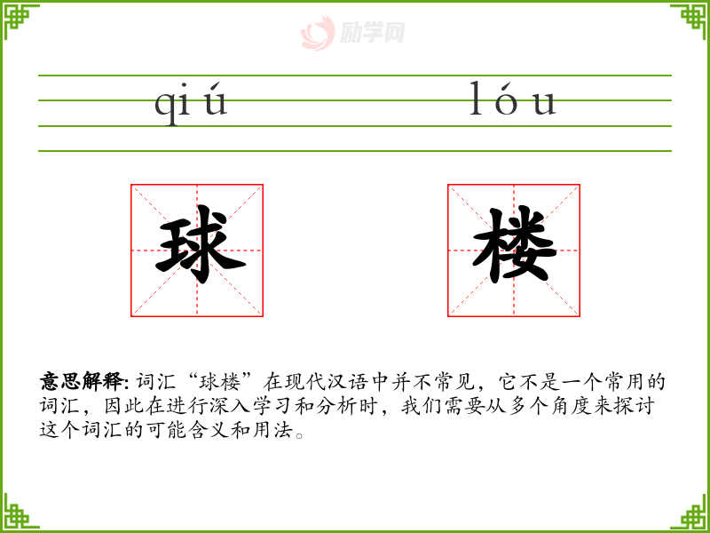 词汇“球楼”在现代汉语中并不常见,它不是一个常用的词汇,因此在进行深入学*和分析时,我们需要从多个角度来探讨这个词汇的可能含义和用法。