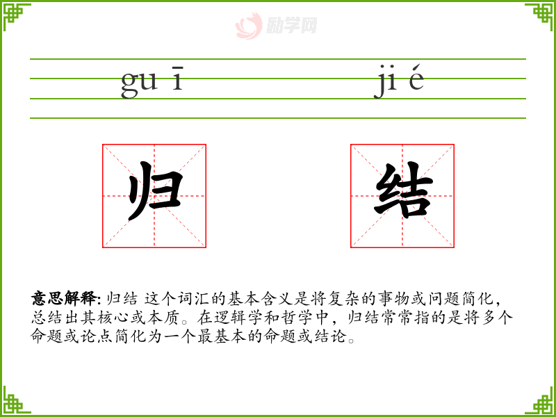 归结 源自汉语,其字面意思是通过“归”(返回、归纳)和“结”(结束、总结)两个字组合而成。在古代汉语中,这个词就已经用来表示总结和归纳的意思。