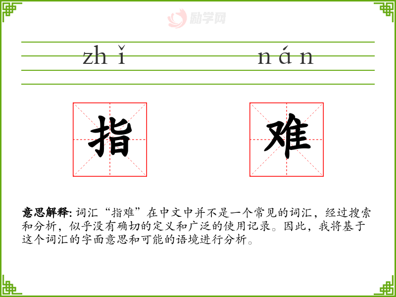 词汇“指难”在中文中并不是一个常见的词汇,经过搜索和分析,似乎没有确切的定义和广泛的使用记录。因此,我将基于这个词汇的字面意思和可能的语境进行分析。