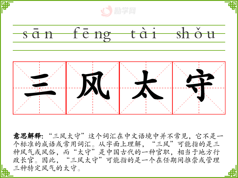 “三风太守”这个词汇虽然不常见,但它可以作为一个象征性的词汇,用于描述理想中的官员形象。在语言学*和表达中,了解这样的词汇可以帮助我们更好地理解文学作品和文化背景。