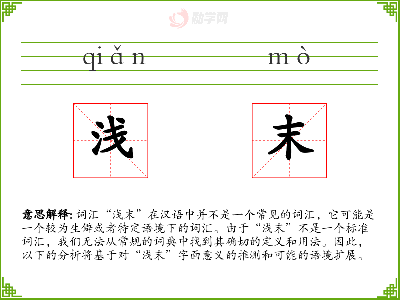 词汇“浅末”在汉语中并不是一个常见的词汇,它可能是一个较为生僻或者特定语境下的词汇。由于“浅末”不是一个标准词汇,我们无法从常规的词典中找到其确切的定义和用法。因此,以下的分析将基于对“浅末”字面意义的推测和可能的语境扩展。
