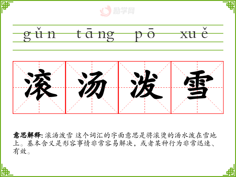 滚汤泼雪 这个词汇的字面意思是将滚烫的汤水泼在雪地上。基本含义是形容事情非常容易解决,或者某种行为非常迅速、有效。