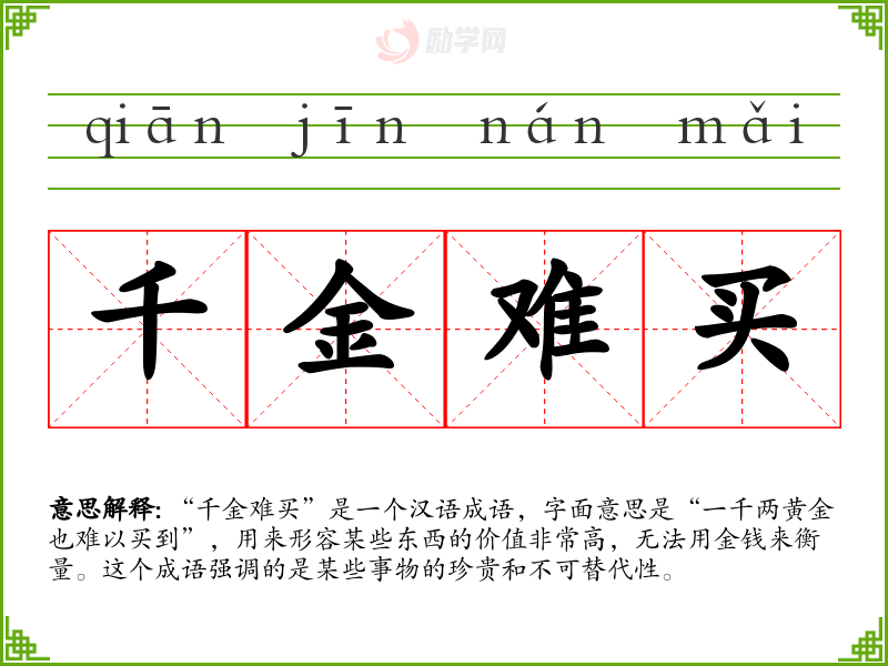 “千金难买”这个成语的词源可以追溯到古代,当时黄金是非常珍贵的货币,用“千金”来形容某物的价值极高。随着时间的推移,这个成语被广泛使用,并保留了其原始的意义。