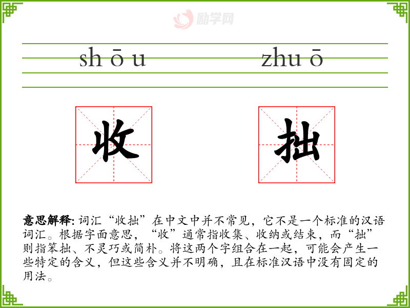 词源与演变: “收拙”这个词没有明确的词源和历史演变记录,因为它不是一个标准词汇。