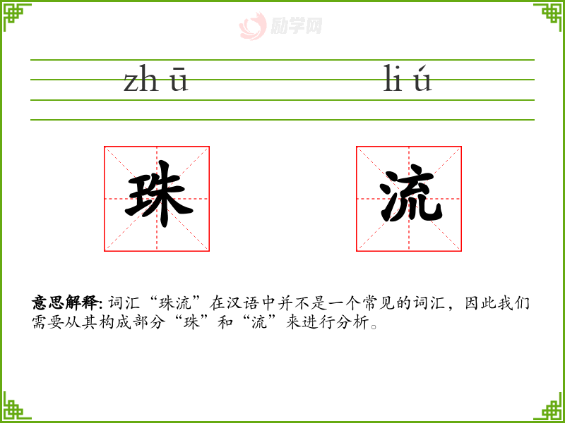 词汇“珠流”在汉语中并不是一个常见的词汇,因此我们需要从其构成部分“珠”和“流”来进行分析。