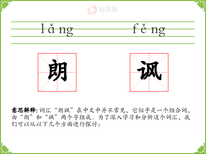 词汇“朗讽”在中文中并不常见,它似乎是一个组合词,由“朗”和“讽”两个字组成。为了深入学习和分析这个词汇,我们可以从以下几个方面进行探讨: