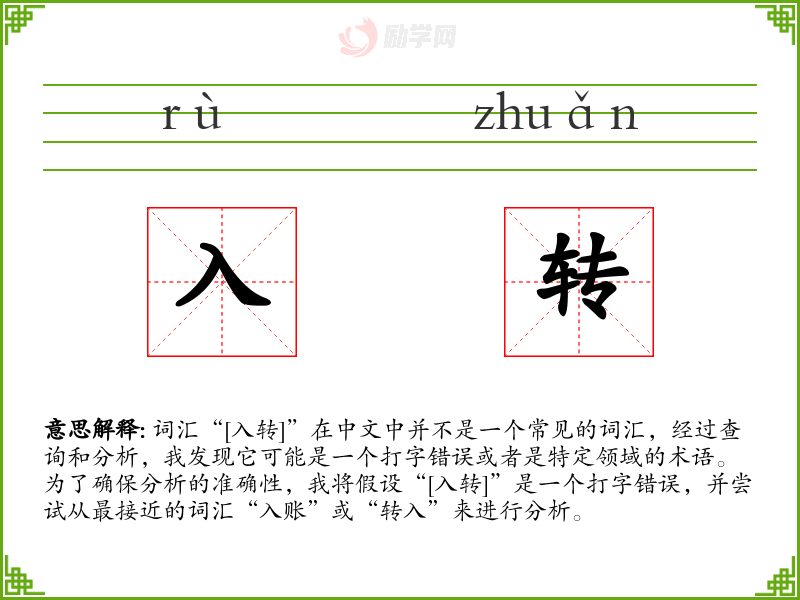词汇“[入转]”在中文中并不是一个常见的词汇,经过查询和分析,我发现它可能是一个打字错误或者是特定领域的术语。为了确保分析的准确性,我将假设“[入转]”是一个打字错误,并尝试从最接近的词汇“入账”或“转入”来进行分析。